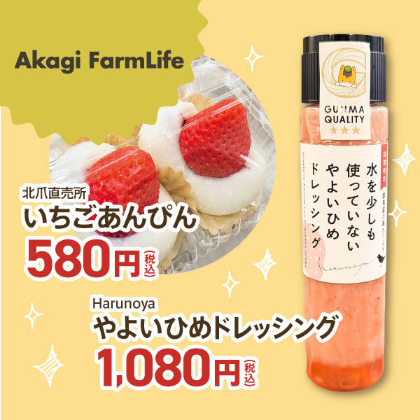 直売所「Akagi Farm Life」では、HARUNOHI やアキヒロイチゴ園、桑原いちご園、いちよんいちご、伊藤園芸いちごハウスなど前橋市内外のイチゴ農家の新鮮イチゴや加工品を並べている。