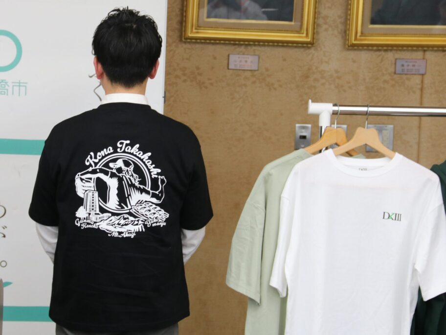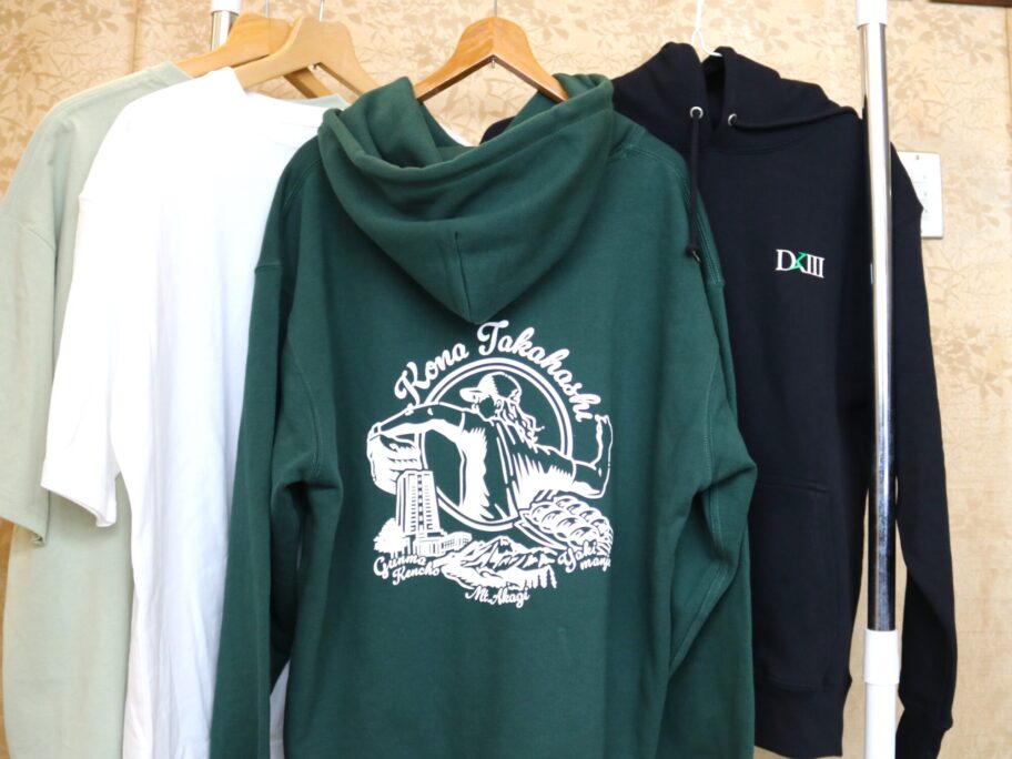 Tシャツ、パーカーともに背部に高橋投手のダイナミックな投球フォームと赤城山、群馬県庁、焼きまんじゅうがデザインされ、一目で「前橋愛」を感じられる。