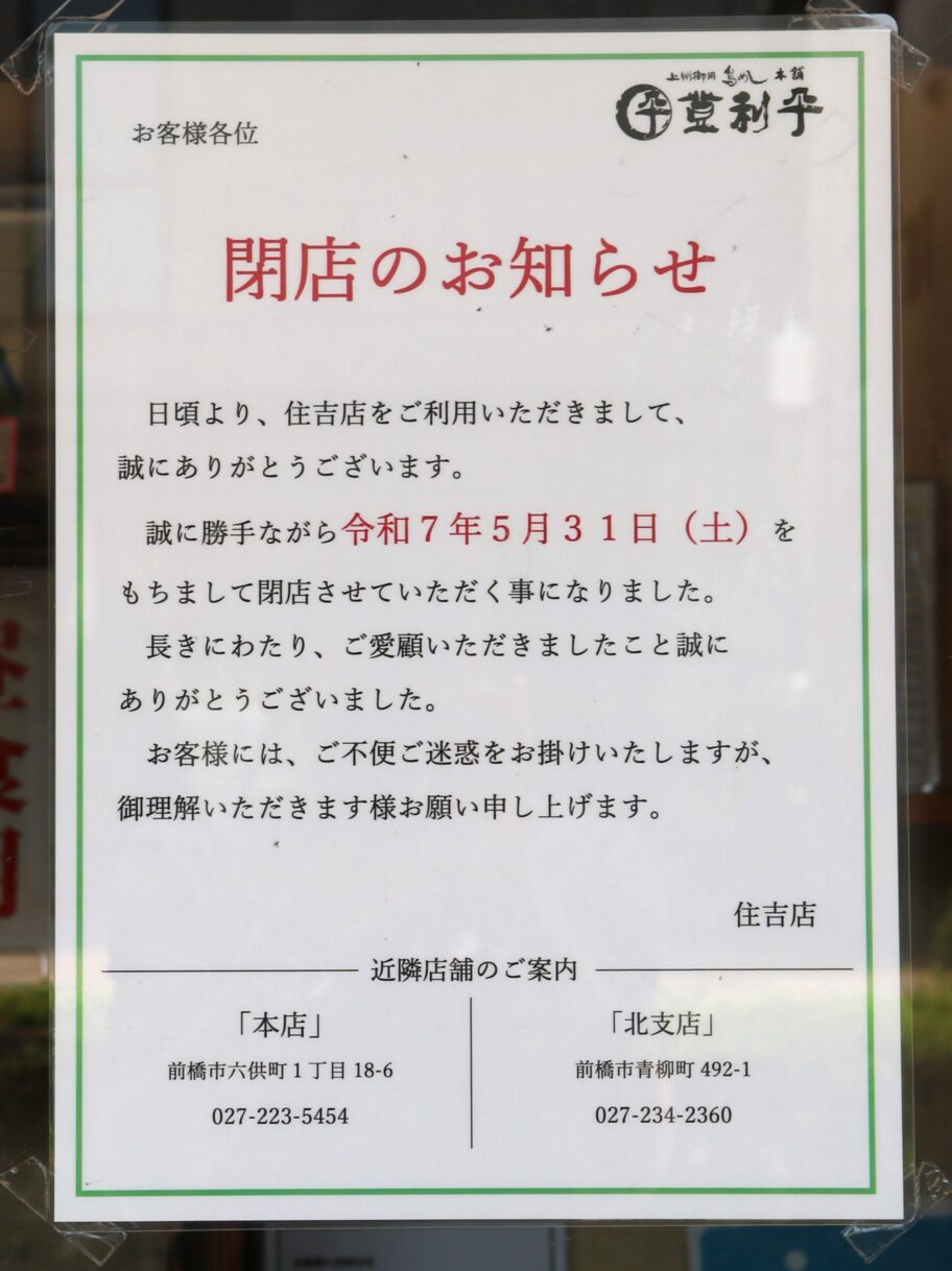 登利平住吉店 5月末で閉店