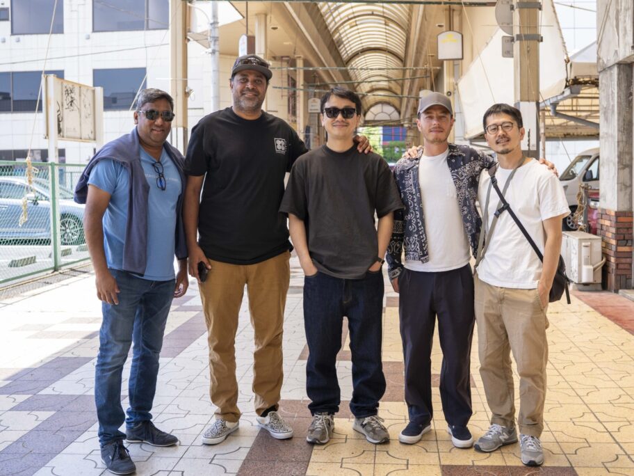 ▲盛り上がりを見せるオリオン通り。クラフトジンの「双子蒸留所」のスタッフらと共に。真ん中が三好さん