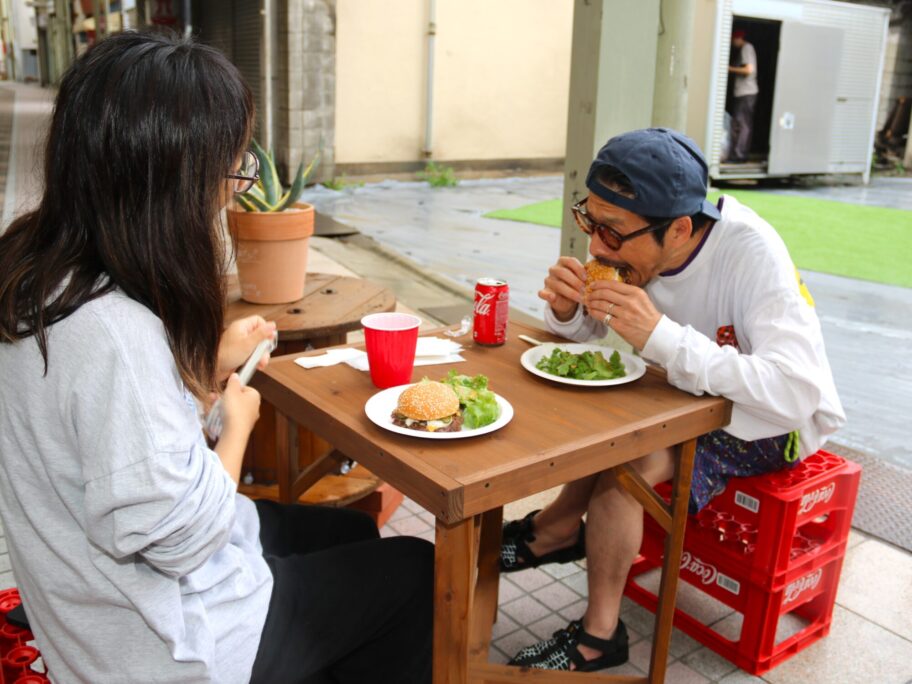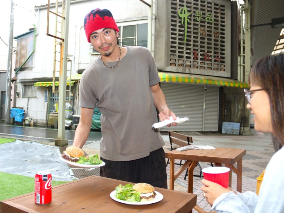 食べログハンバーガー百名店に初選出された日吉町の「ヒッチハイカーズバーガースタンド」のオーナー、カタオカ・リョウさんは宮山さんと親交があり、開店初日にお祝いに駆け付けた。