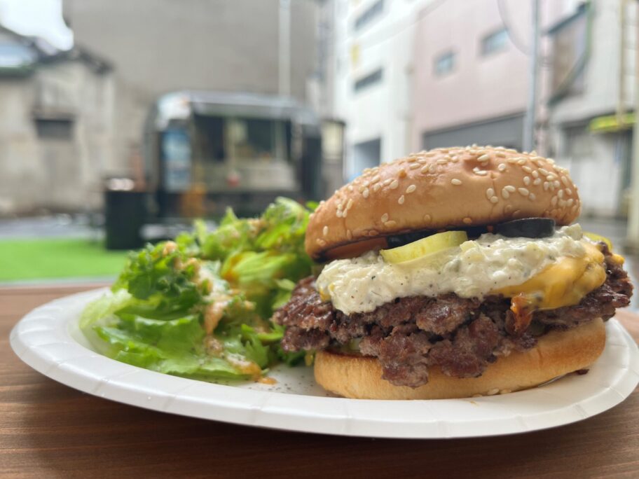 「肉がカリッとクリスピーになる米国生まれのスマッシュバーガーです。ボリュームがありながら食べやすい。県内では珍しいですよ」。バンズに挟んで自家製のタルタルソースをたっぷり乗せ、ケチャップとマスタードを加えたらオリーブとピクルスを加えて出来上がり。