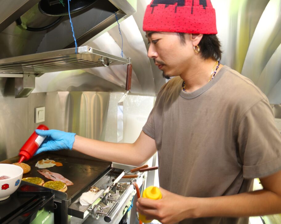 人工芝の上にポツンと置かれたトレーラーハウスの中、店長の宮山尚也さん(34)が鉄板の前に立って調理する。球形に成形したパティを鉄板に置くと、コテでギューッと押し付けて薄く焼き上げる。
