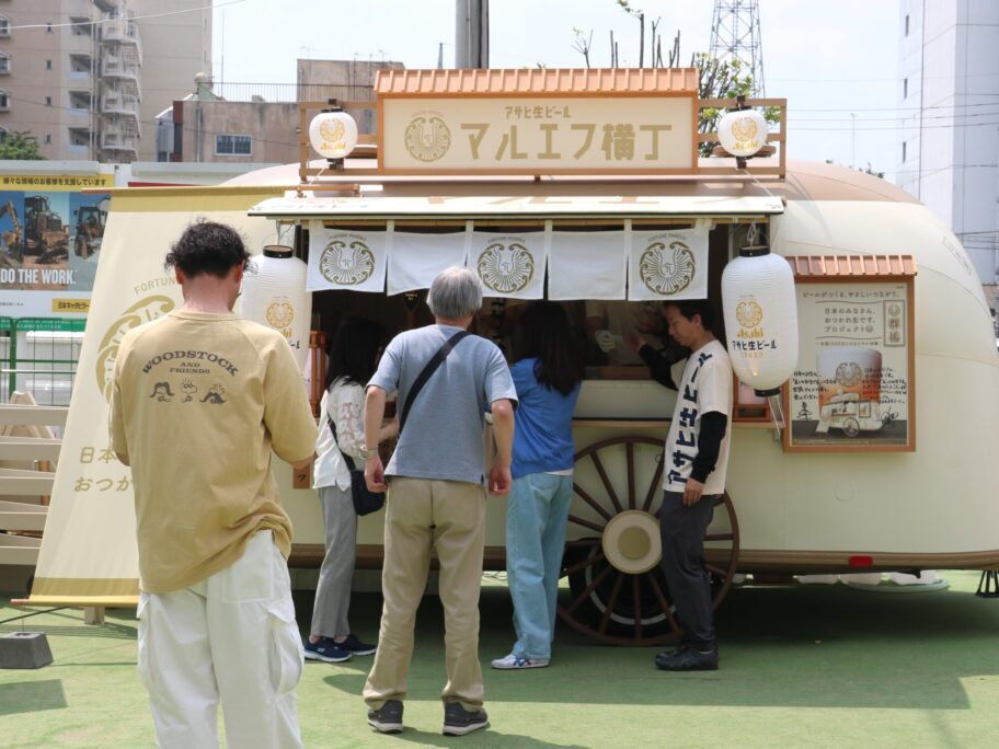出張マルエフ横丁は移動式のイベントカー、マルエフカーを使用した特設ビアガーデン。「まろやか注ぎ」や「シャープ注ぎ」などビールの注ぎ方によって変わる味わいを楽しめる。
