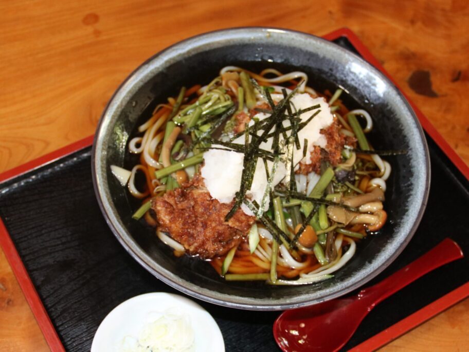 2代目の松井政和さんは「ヒレカツを厚めに切り、噛んだ時の食感と香りをき出した」と改良点を説明する。出汁の効いたソースに絡ませ、まろやかでなじみやすい味に仕上げている。蕎麦、うどんとのセットで1580円。