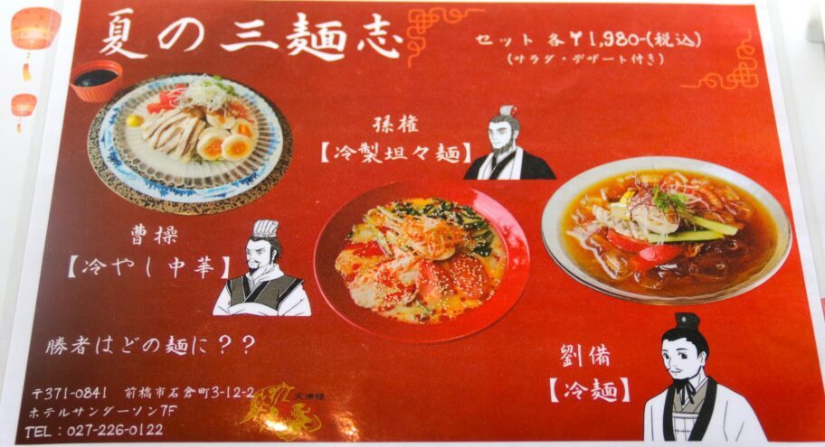 「夏の三麺志」なる面白い企画をしているのは「天津楼 菜々久(さいさいきゅう)」。魏の曹操の「冷やし中華」、呉の孫権の「冷製担々麺」、蜀の劉備の「冷麺」が天下統一を目指し激突しています。みんな食べて征服してやりましょう。