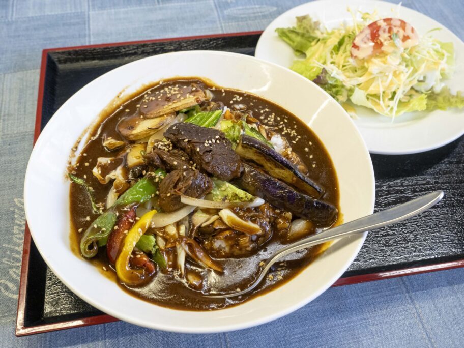 「焼肉ハウス 柿の実」は牛タン牛スジコラボカレーがあります。牛スジを煮てスープを取ってルウを加え、牛タンは別に煮込みます。カレーはコラーゲンたっぷり。ナス、ジャガイモ、キャベツ、パプリカ、玉ネギ、ニンジン、キノコと野菜も豊富で、健康と美容にいい感じです。