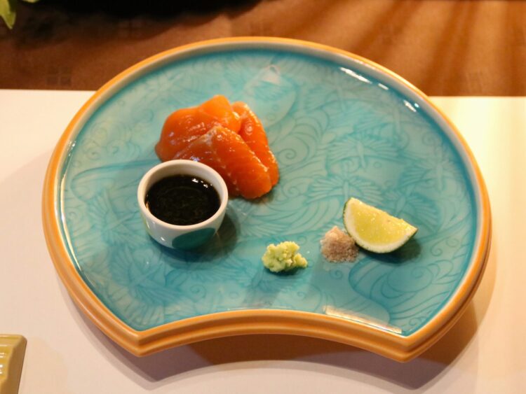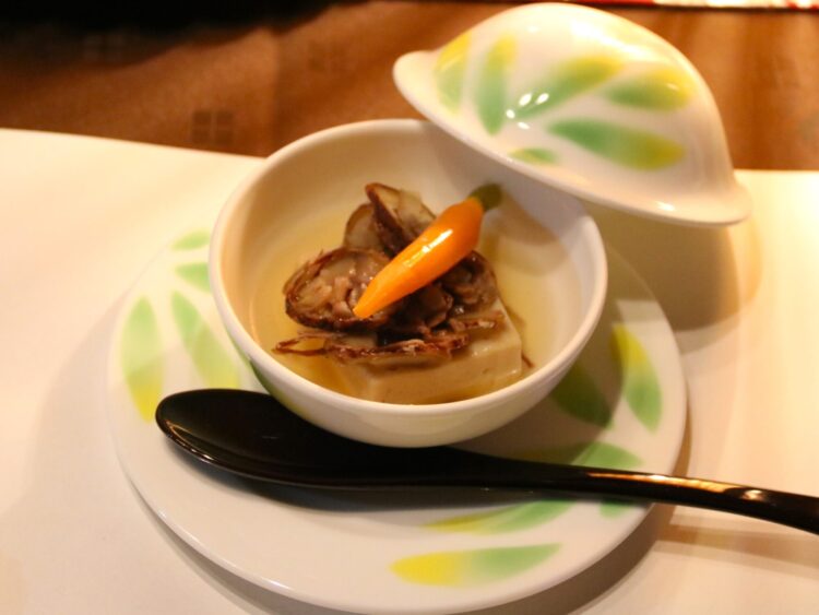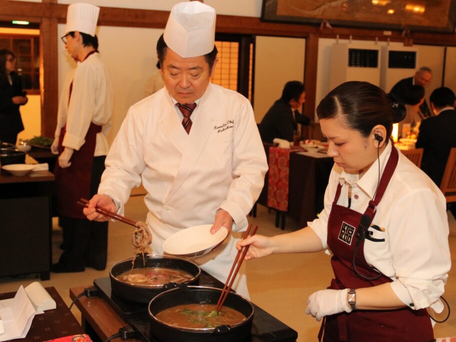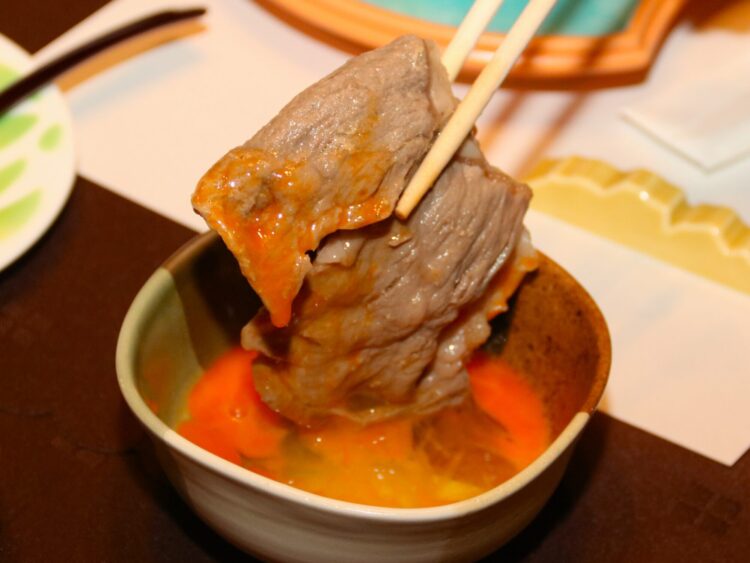 最高級のニジマス「ギンヒカリ」のお造り、姫人参を添えた手作り胡麻豆腐と栗の渋皮煮に続いて、「臨江閣すき焼き」と命名したメイン料理が登場する。