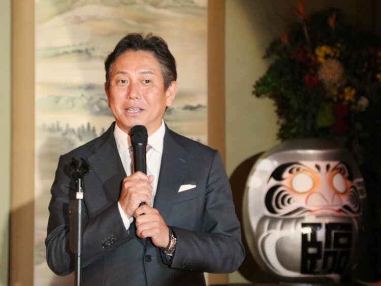 ▲「臨江閣は前橋の宝」と称え、乾杯の音頭を取る金子昌彦前橋商工会議所会頭