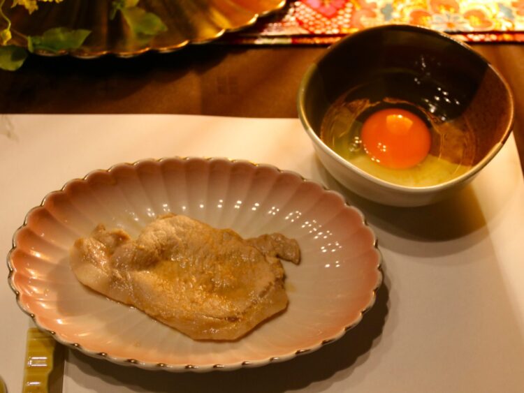 上州牛のサーロインと氷室豚をグループごとに専属の調理人が調理する。油が飛ばず、匂いがこもらないよう、IHクッキングヒーターを使い、ゆっくり煮込むように仕上げる。割下は正田醤油をベースに卵黄入りの玉味噌を合わせたコクのある味わい。安全・安心な飼料で育てた卵に絡めていただく。