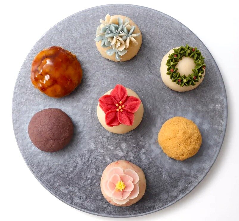 12月の「師走」は甘酸っぱいカシスソースを忍ばせた「ポインセチア」、濃厚な抹茶でクリスマスリースを模した「リース」、白餡にゆずを香らせ銀箔をのせた「初雪」があり、単品のほか7種を詰めたギフトボックスも用意している。