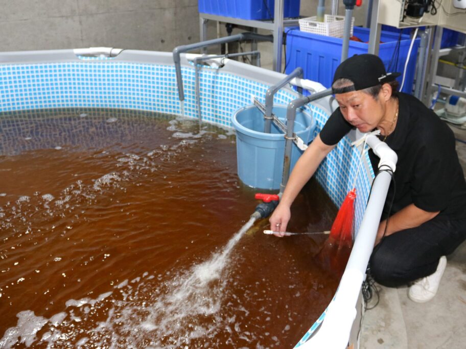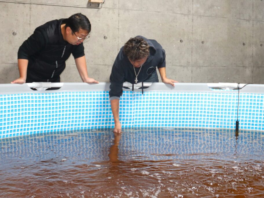 エビは成長過程で何度も脱皮を繰り返すため、殻が沈殿してしまう。「糞とともに小まめに取り除かなければ水が汚れ、エビの健康に害となる。これは手作業でやるしかなく、一番大変な作業」と養殖現場を担当する加藤将人さん。