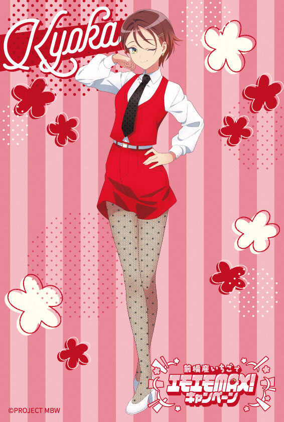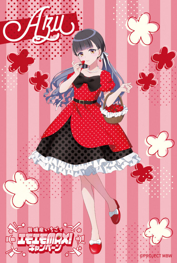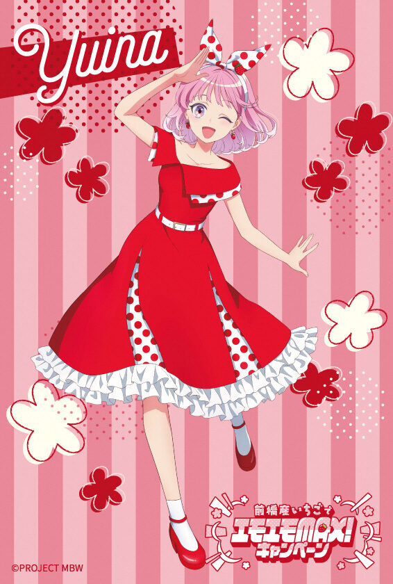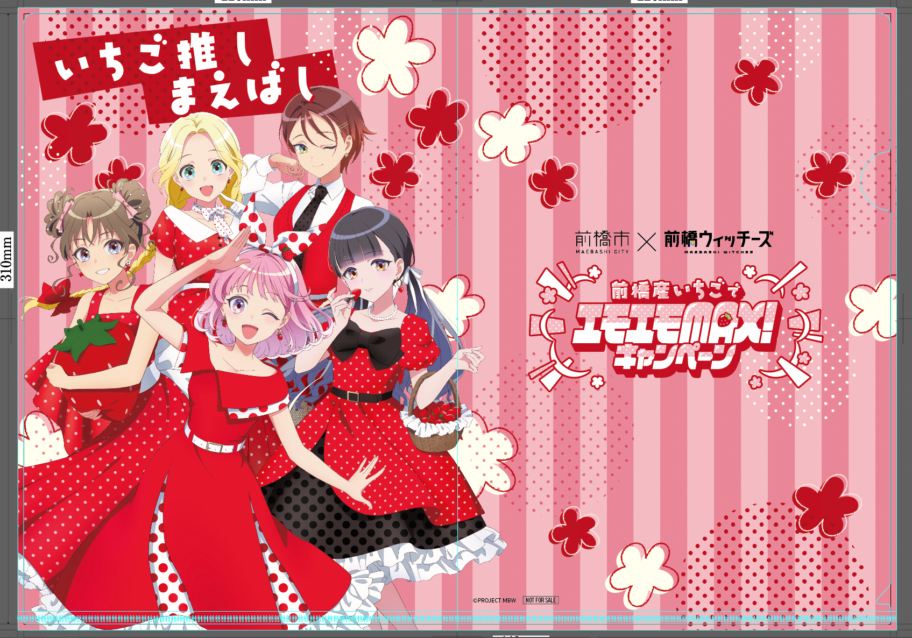 ノベルティはクリアファイル、ポストカードともに書き下ろし。ピンクのストライプ柄を背景に、「前橋ウィッチーズ」のメンバー5人が赤い衣装に身を包み、イチゴを手にしたり、イチゴのピアスを着けたりしたデザインに仕上げた。クリアファイルは5000枚、ポストカードは5種を各1400枚製作。いずれもなくなり次第終了となる。