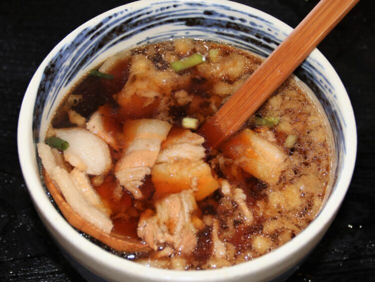 自慢の「うまか」は冷水で締めたコシの強い太いうどんを豚バラ、揚げ玉、ネギの入ったたっぷりの熱々の汁に浸して食べる。