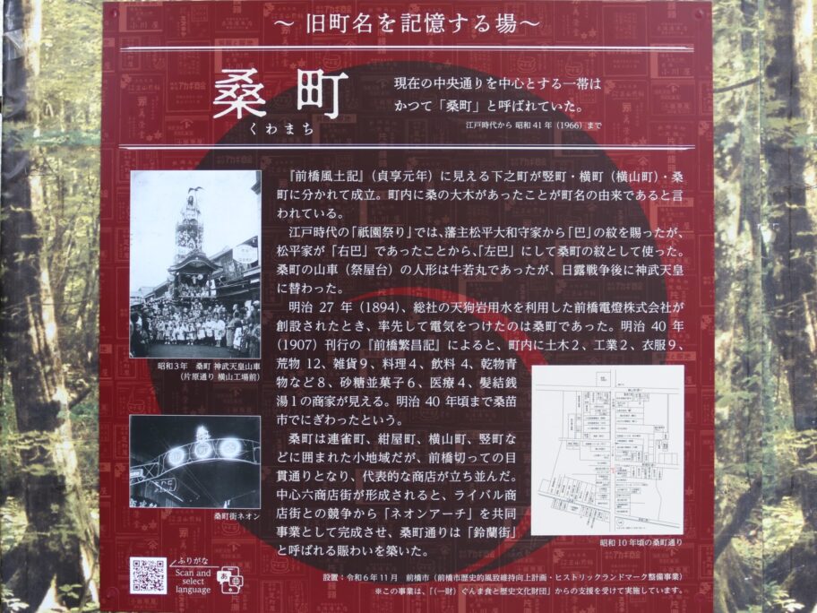 1960年代半ばまで使われ、いまもなお愛着を持って呼ばれる旧町名を後世に伝えるため、前橋市は旧町名の由来を記した案内板の設置を始めた。歴史まちづくり計画に位置付けたヒストリックランドマーク整備事業の一環。中央通りに昨年11月、前橋空襲の爆撃照準点を示すマンホールとともに設置した「桑町」の案内板を皮切りに、これまでに11カ所に置かれている。