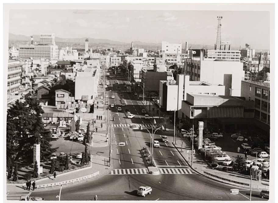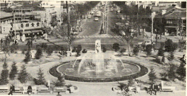 ▲田中町の案内板▼噴水のある前橋駅前=広報まえばし・1966(昭和41)年