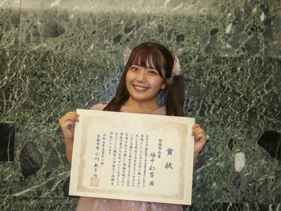 高校生から社会人までが一堂に集まり、地域社会に提言するプレゼンイベント「MEDぐんま2025」が5月11日、前橋・群馬会館で開かれた。「遠近 をちこち」をテーマに12組がそれぞれの専門分野や取り組んでいる活動を発表した。最も優れたプレゼンターに贈る前橋市長賞はMEDに2度目の出場となったご当地アイドルグループ「あかぎ団」の礒干彩香(いそひ・あやか)さんが選ばれた。