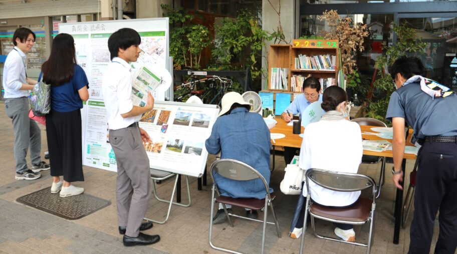 再開発の現状を多くの市民に知ってもらうため、準備組合事務局はcomm3階で説明会を開いている。再開発をめぐる経緯や役割、資金計画、スケジュール、完成イメージをパネルを使って説明、質問に答える。アンケートも行っている。10時~17時。