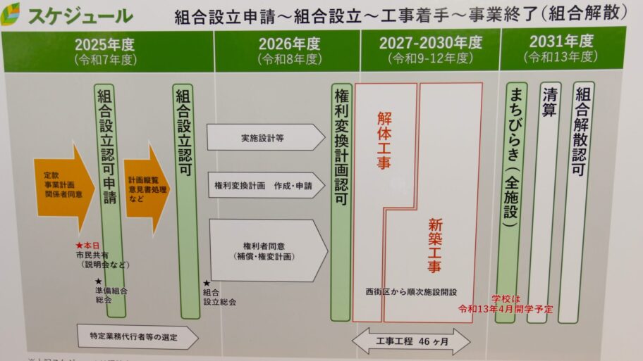2025年度中に現行の準備組合をもとに法人格のある千代田町中心拠点地区市街地再開発組合を設立、実施設計や権利変換計画作成にあたり、計画が認可され次第、既存施設の解体、新築にあたる。
