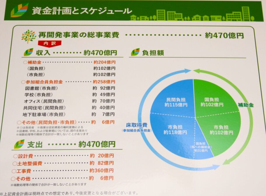 当初、概算で200億円から300億円を見込んでいた総事業費は建築資材や人件費の上昇から上振れした。収入は補助金204億円(国、市負担2分の1)、参加組合員負担金258億円、その他6億円。関係者からおおむね同意を得られたことから、この金額をもとに計画を推進する。