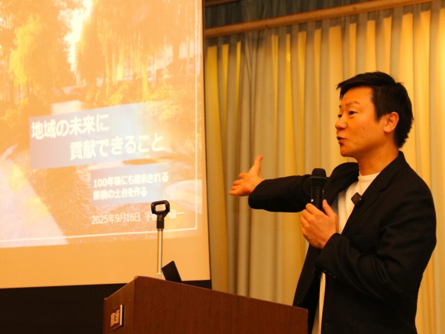 ▲100年後を見据えたまちづくりを語る宇留賀さん