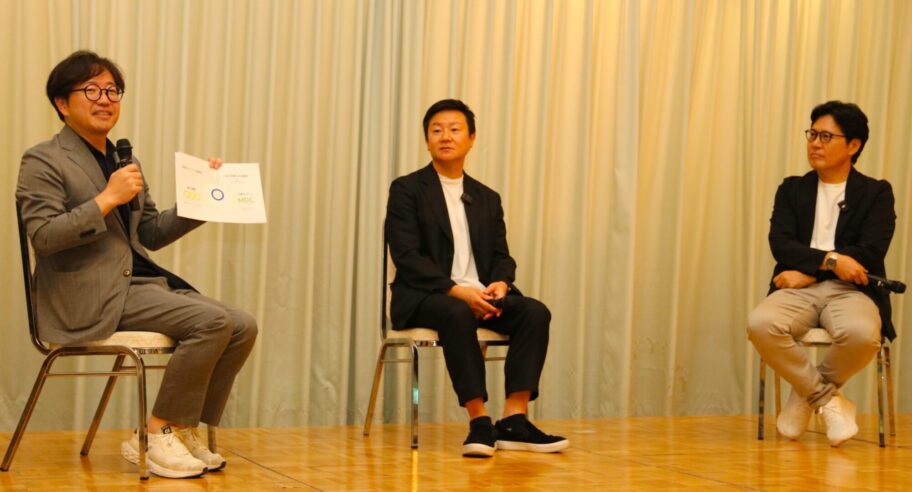 ▲MMAの橋本薫代表理事(左)の進行で対談する宇留賀さん(中央)と田中さん