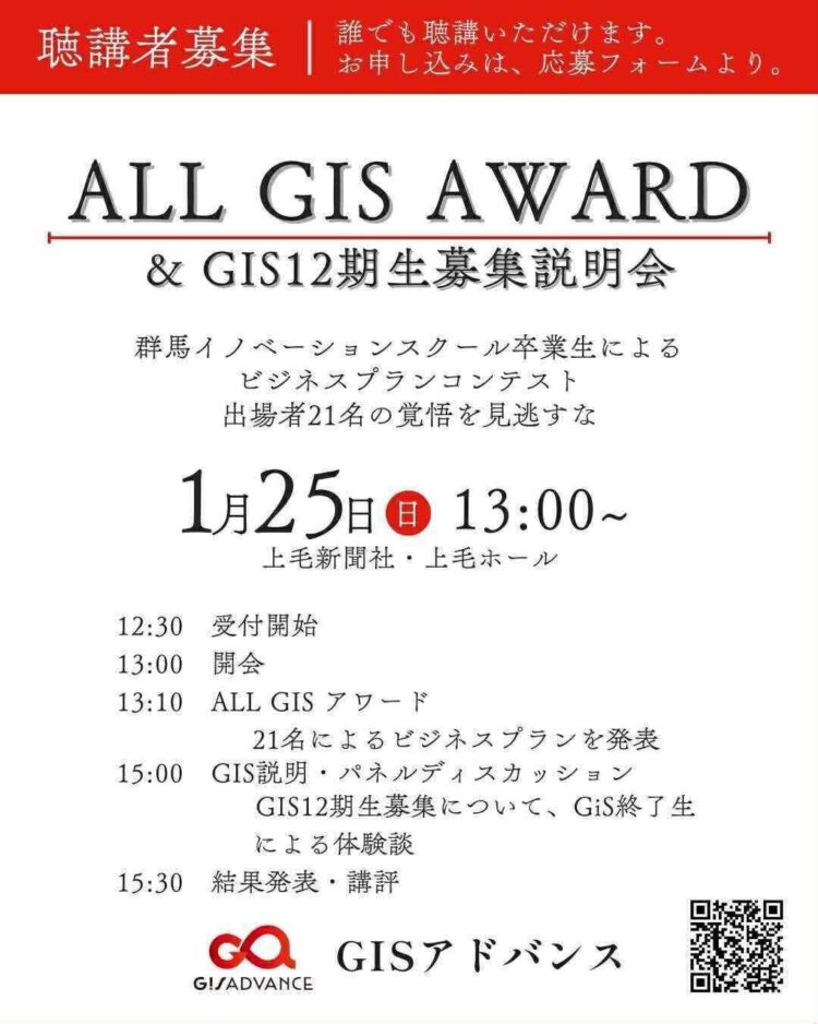 次代を担う起業家や地域活動家を発掘、育成する群馬イノベーションスクール(GIS)の修了生によるビジネスプランコンテスト「オールGISアワード」が1月25日、上毛新聞社上毛ホールで開かれる。併せて、4月に開講するGIS12期生の募集説明会を開く。