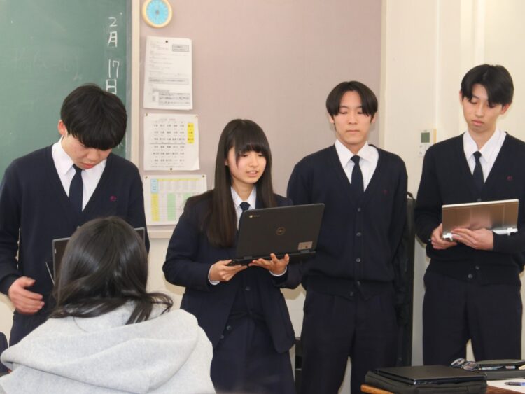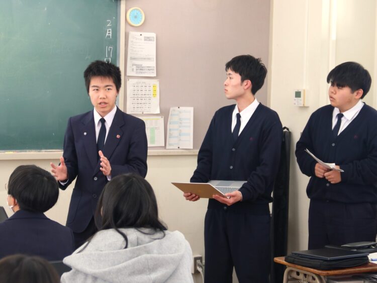 前橋南高校(原拡史校長)の「総合的な探究の授業」成果発表会が2月17日開かれ、2学年の生徒が3、4人のグループに分かれて調査、取材、研究してきた課題についてプレゼンした。「地域」をテーマにした班では前橋市中心街の活性化を取り上げたグループが多く、伴走型で開業支援する前橋市のマチスタントの機能と情報発信の強化を求めた。