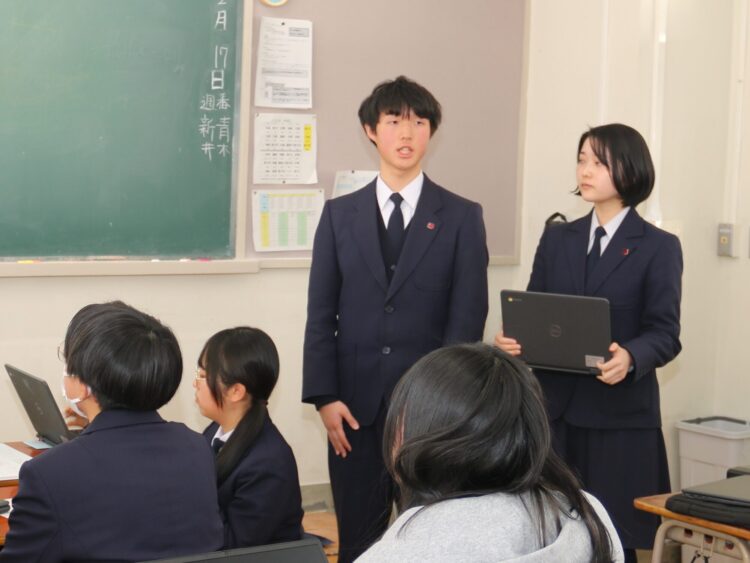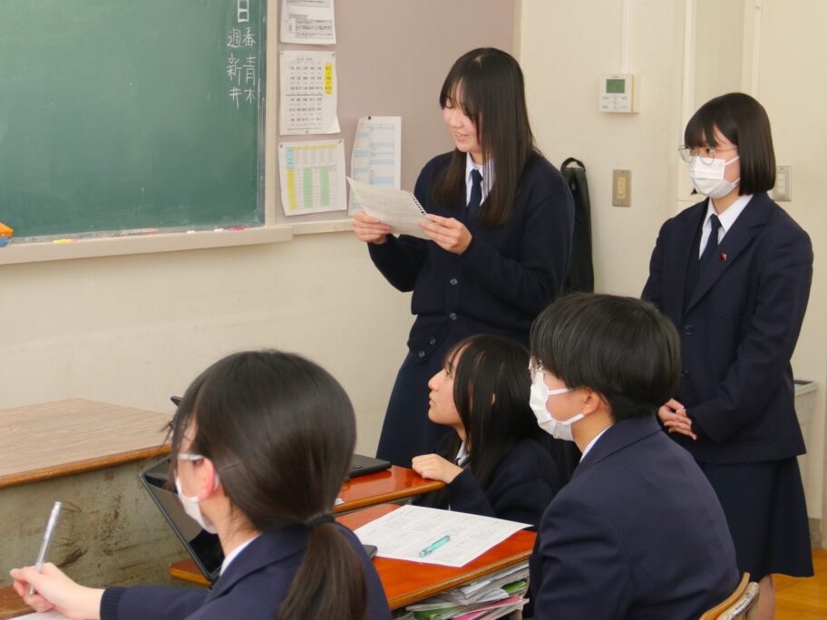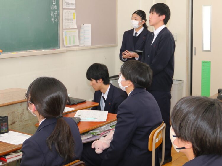 情報社会をテーマにした細川栞さん、大河原優那さん、宮澤愛佳さんは「前橋新聞me bu ku」を徹底研究した。新聞版とWeb版のそれぞれの長所と短所を指摘、「インスタやTikTokでカフェやフェス、勉強スペース、各高校のイベント情報を発信していく」としながら、「紙で発信するからこそ得られる温かみを感じてもらう」として紙面の教室掲示を提案した。