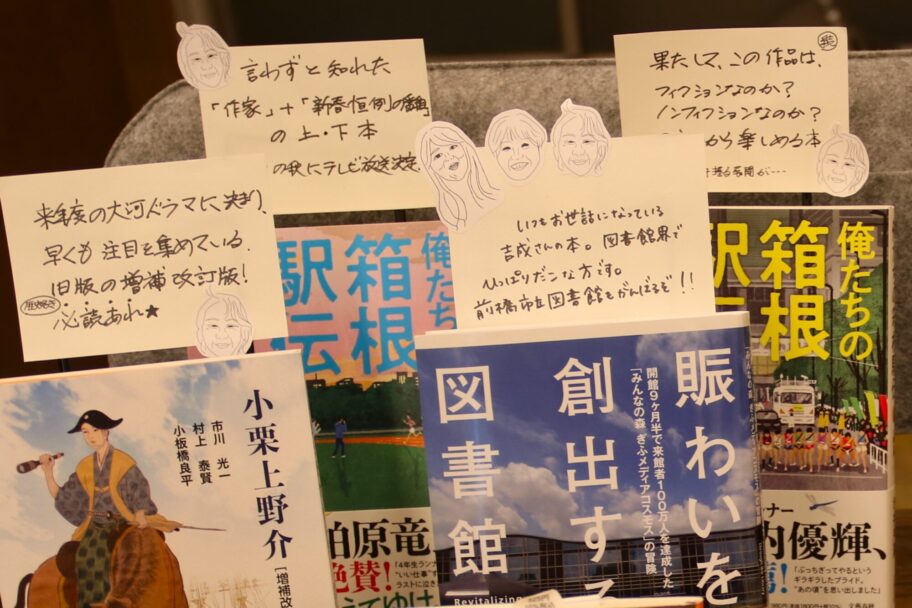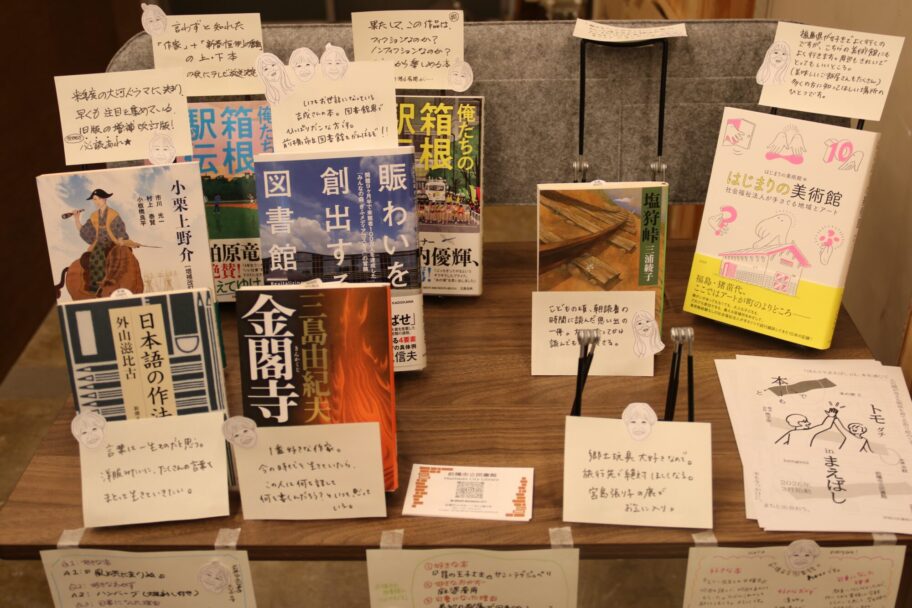 一方、中央通りにある水紋はレジ横に特設コーナーを置いた。池井戸潤さんの話題作『俺たちの箱根駅伝』、三島由紀夫の『金閣寺』など10冊が並び、3人の司書のメッセージが書かれている。