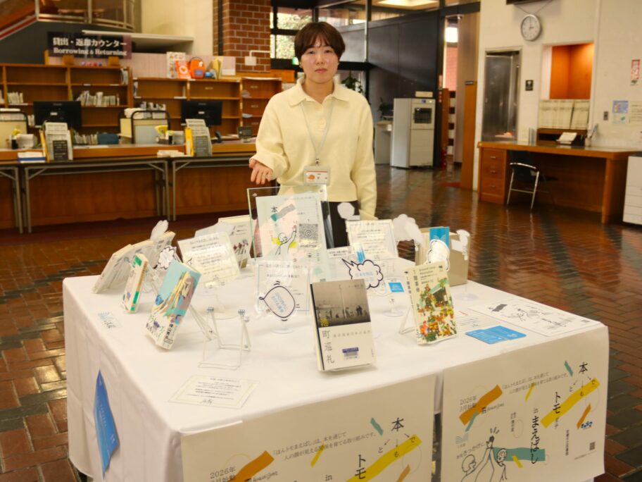 市立図書館は貸出カウンター前の特設コーナーに水紋のオーナー、小澤亮太さんが推薦する10冊を並べている。