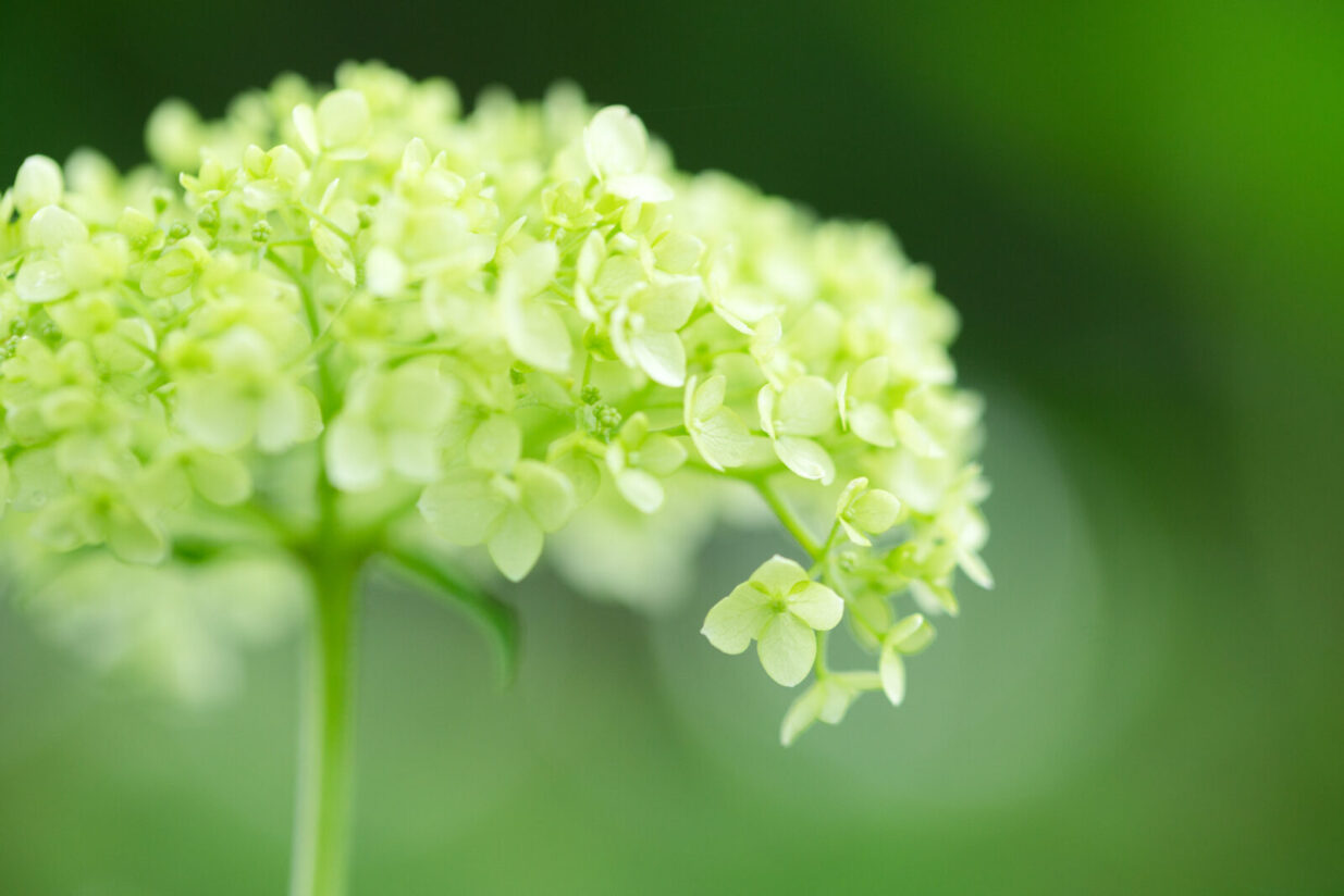 この元気のでる緑色のグラデーションがほんのりと薄く色づいたアナベルの花の色をよりいっそう引き立ててくれるのです。