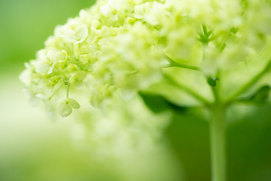 青々とした紫陽花の葉っぱがマクロ撮影によってボケると、とっても良い背景となってくれます。