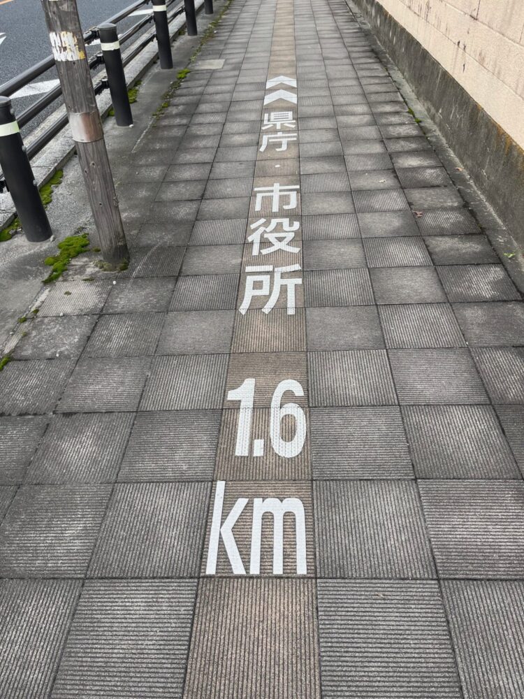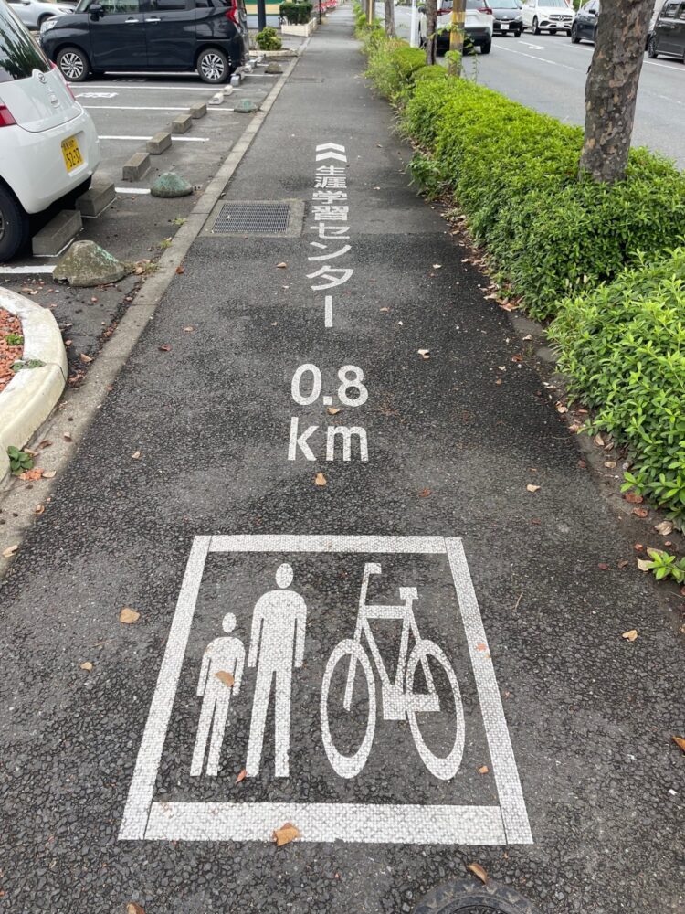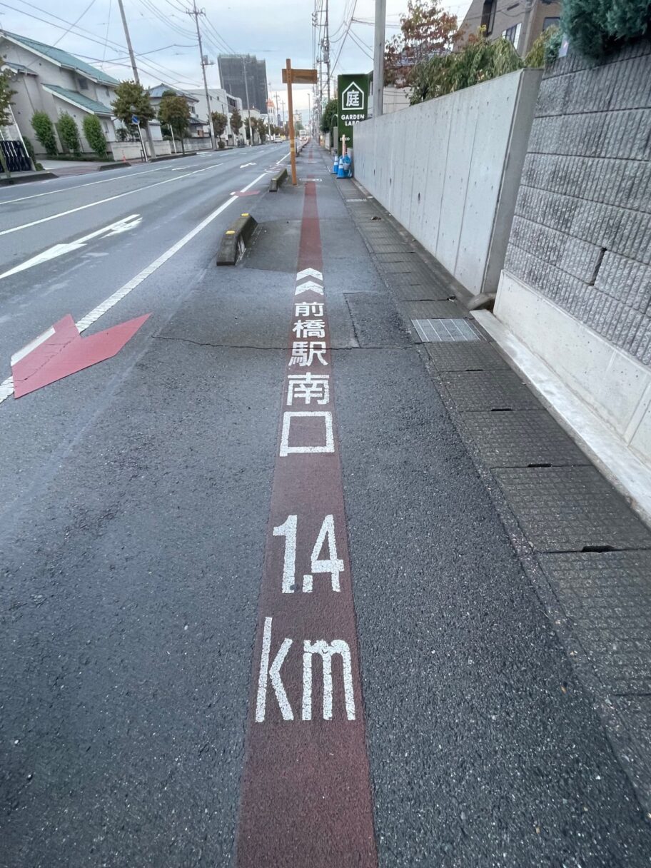 見かけると、ホッとする。路面にプリントされている「生涯学習センター0.8Km」、「前橋駅南口1.4Km」などの表示だ。歩行者というより、多分自転車利用の人向けだろう。縦長に表示されているから、自転車の高さから見やすくなっている。
