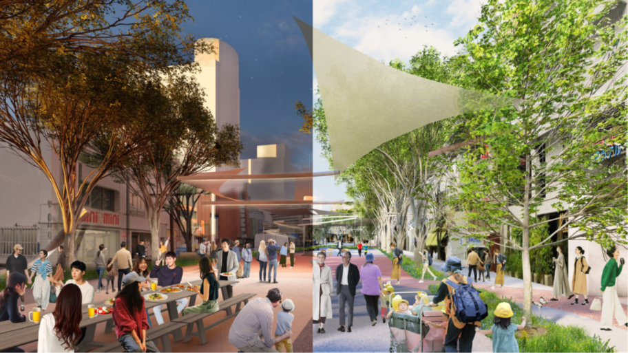 ③ 県民広場は、現在のフレキシブルな活用を残しつつ、メ-ンストリートのトランジットモール化に対応したモビリティハブの設置により、現在の特徴と未来の可能性を融合させている。