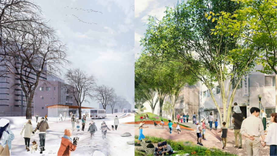 ① 五差路を含めた全体デザインが、前橋の豊かな自然や文化、街の特徴である壮大な空の広がりと山並みを望む景色など、前橋ならではの強みやアイデンティティを的確に捉えている。