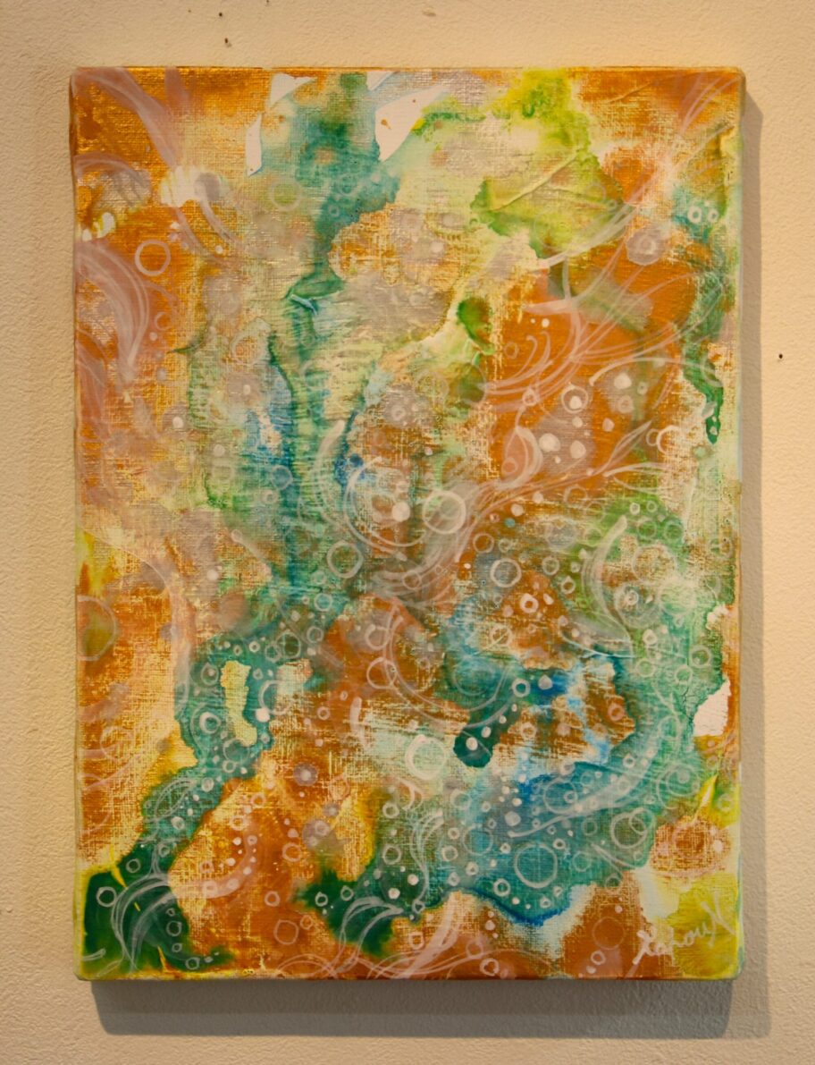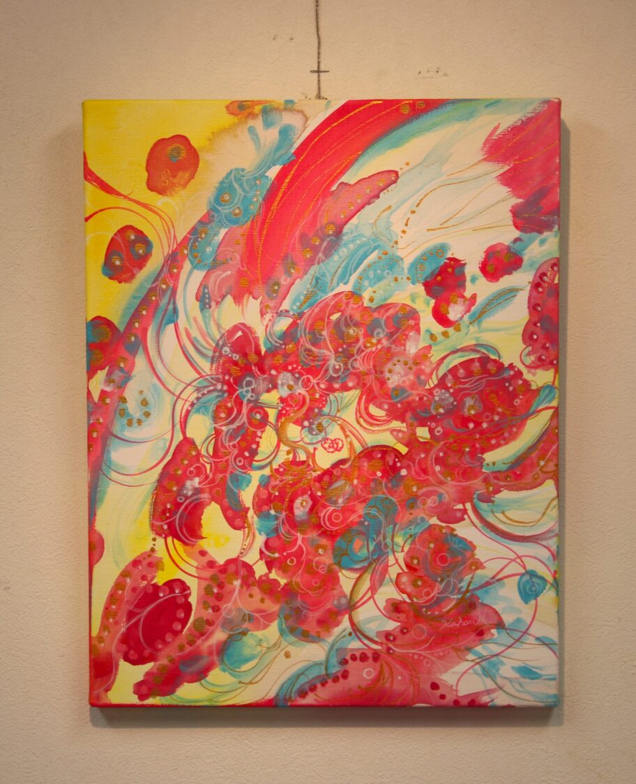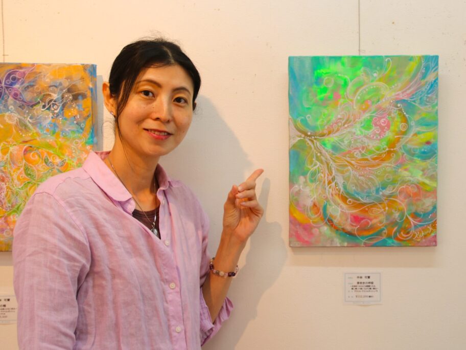 自然からインスパイアされた溢れる色彩と曲線を多用したアクリル絵画制作を手掛ける中林可寶さん(前橋市)の新作を集めた個展「春風~Harukaze~」が4月12日、ギャラリーあーとかんで始まった。自然の芽吹きや生命の息吹を感じられる明るい色調の抽象画26点が並んでいる。20日まで。