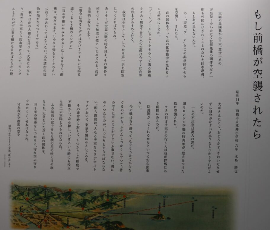 入館して最初にあるのが昭和11年に当時の桃井小6年生が書いた「もし前橋が空襲されたら」と題した作文。これもまた「同じ6年生が読んでどう感じるか」と想起させるため、導入展示にしたという。