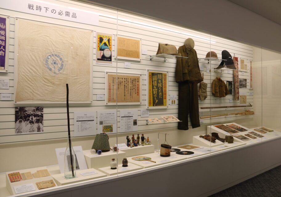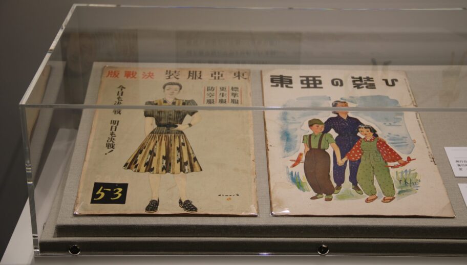 兵隊の無事の帰還を願った千人針や戦時下の暮らしを偲ぶ衣装や日用品、戦意高揚を図るポスターや雑誌が並ぶ中、女性用のファッション誌があった。タンスに眠っていた衣類を再利用しておしゃれに気を配るたくましさもあったことがうかがえる。