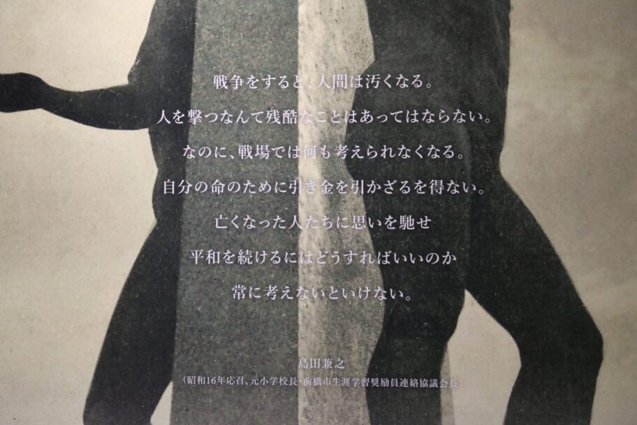 展示の最後は兵隊経験があり、戦後は小学校長を務めた島田兼之さんの言葉。「戦争をすると人間は汚くなる。自分の命のために引き金を引かざるをえない」と強く訴えている。