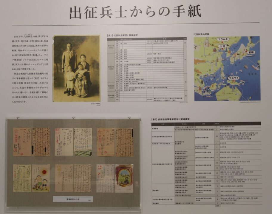 幼子を残して出征した兵士が家族に送った手紙は子供の成長を喜んだり、母親の言うことを聞くように諭すなど、会うことのかなわない家族への優しさが伝わる。最後の方は検閲のため一部が黒塗りされた手紙が増え、死を覚悟した手紙もあった。