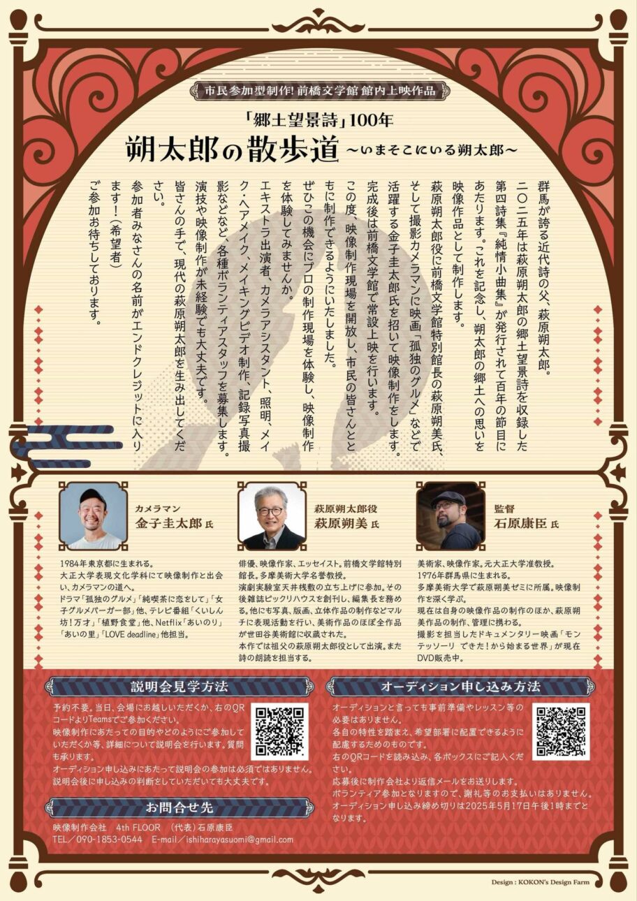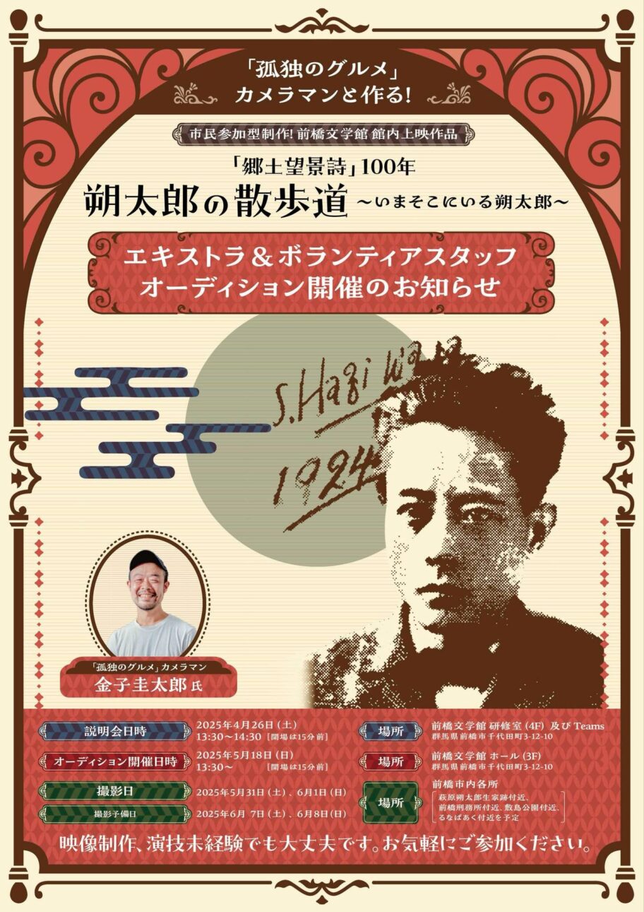 前橋文学館特別館長の萩原朔美さんが祖父の萩原朔太郎を演じる映像作品が制作される。『広瀬川』をはじめ前橋の風景を詠んだ作品集『郷土望景詩』が発表されて100年。市民参加型の記念映像作品『朔太郎の散歩道〜いまそこにいる朔太郎〜』が前橋市内で撮影される。エキストラやボランティアスタッフとして参加する市民を募集しており、4月26日に前橋文学館で説明会を開く。