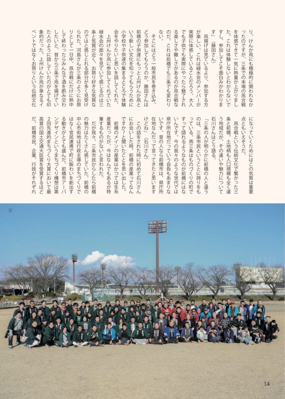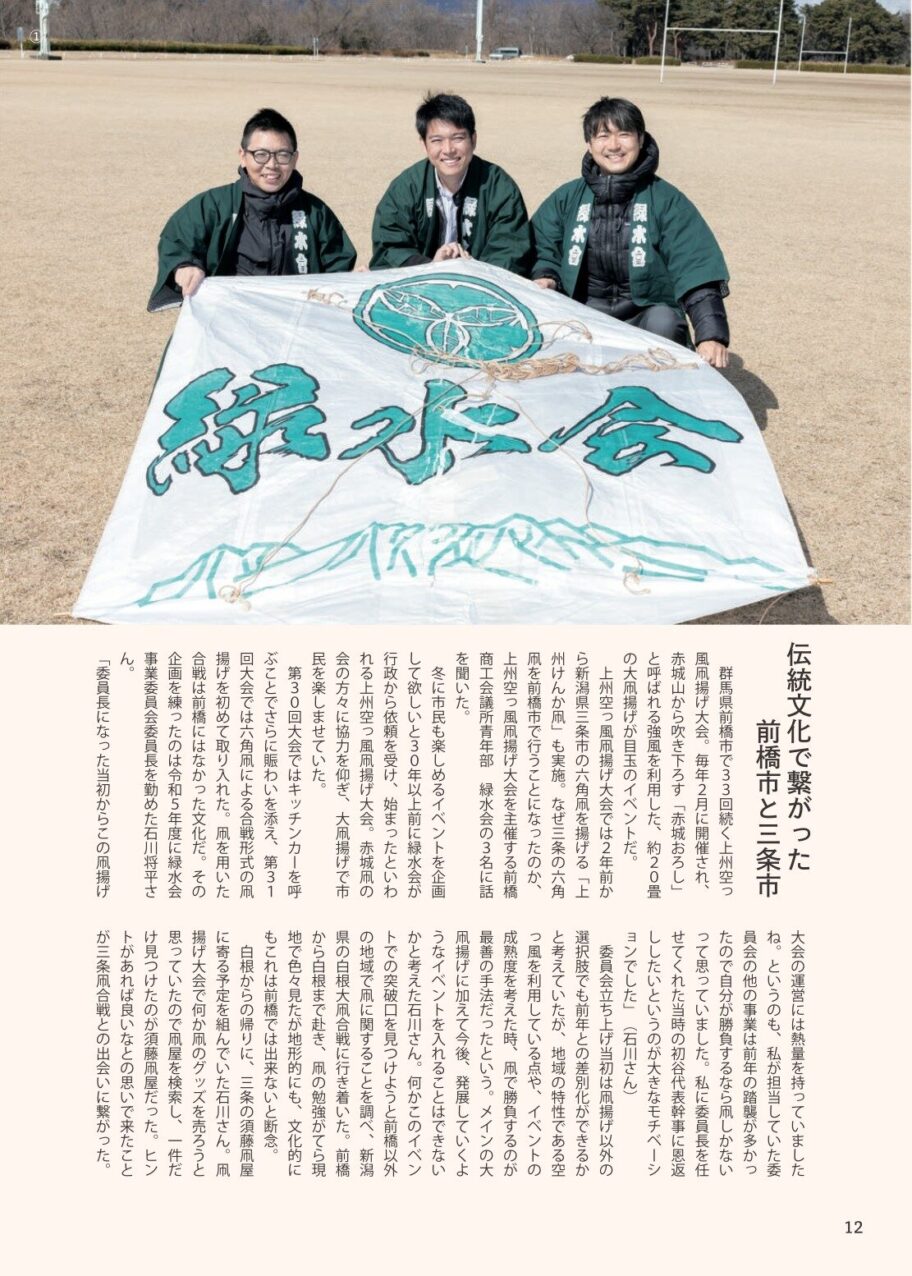 イカマガジンでは「伝統文化で繋がった前橋市と三条市」のタイトルで4㌻に渡って特集が組まれた。凧揚げ大会を中心になって企画、運営してきた石川将平さん、河島優樹さん、藤田順也さんが登場、三条市にならい前橋市で凧合戦を開くようになった経緯や魅力を語っている。