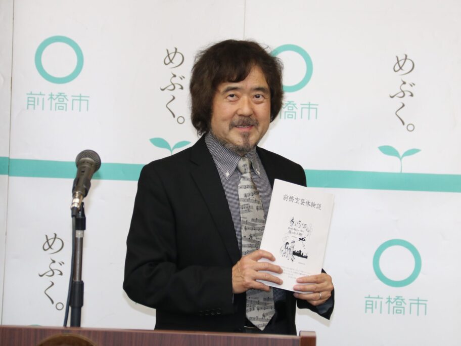 ▲証言集を手にするまえばし市民ミュージカル総監督の新陽一さん