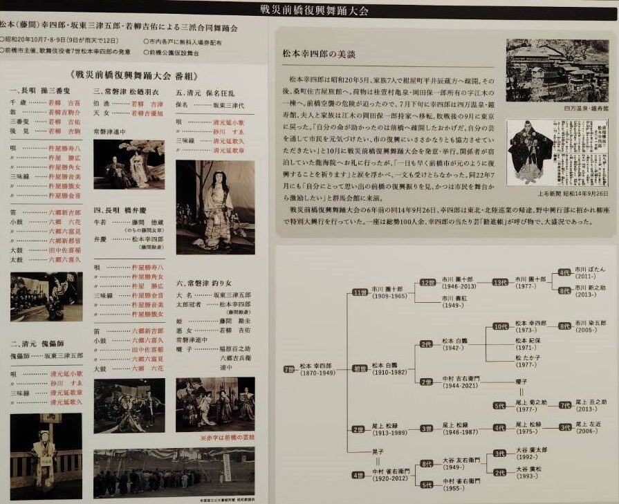 「自分の命が助かったのは前橋へ疎開したおかげだ。自分の芸を通して市民を元気づけたい。市の復興にいささかなりとも協力させていただきたい」と自ら発案、10月に前橋公園に仮設舞台を設け、「橋弁慶」で得意とする弁慶を演じた。