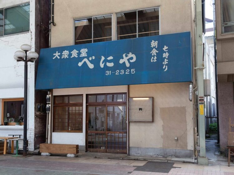 ▲かつての活気を取り戻した大衆食堂「べにや」の青い看板はあえて残している