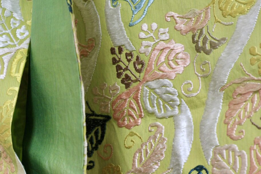 白い糸で織られた立涌は上昇を意味する吉兆の意匠。家紋の桐の意匠が唐草模様のように配置され、ピンクや黄色、水色などの優しい色を多用して織られている。生末さんによると、「この小袖の染色は、全て当時と同じ藍、紅、苅安だけで行っている。植物染料なので、30年を経てかなり色褪せている」という。それでも前身頃の方に回って見ると褪色は後身頃ほどではない。美しい艶のある、見事な織りを間近に見ることができる。