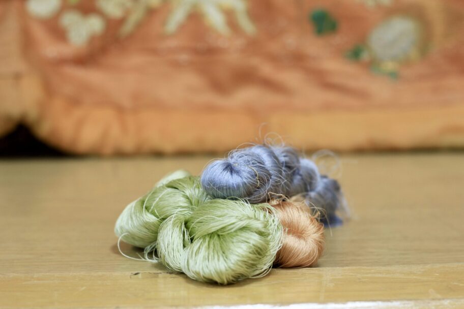 使う糸は、江戸時代の超高品質にも引けを取らないブラジルの日系企業「ブラタク社」の6Aシルク。繭の糸たった3本を撚り合わせたこの絹糸は、髪の毛より細く、かつ非常に丈夫で、現代の技術でも化学繊維でこの細さの糸は作れないという。軽くしなやかで光沢があり、繊細な色の表現がかなう。この糸は永井織物の他には誰もが知る世界的スーパーブランドしか使えない。