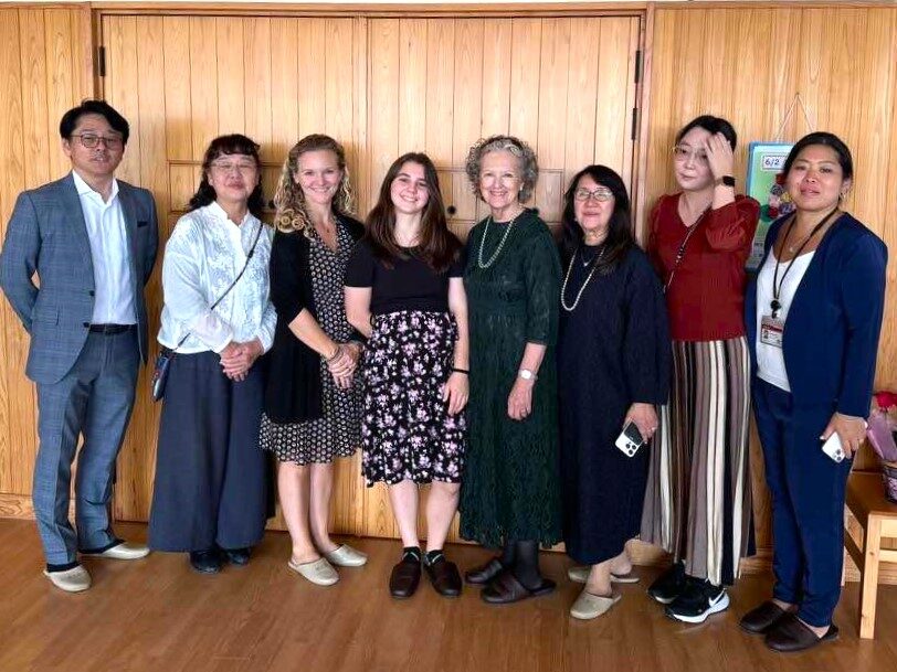 ▲思い出の共愛学園を訪問したナンシーさん(右から4人目)。その左にシドニーと母親