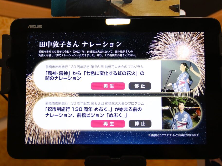 音声ガイドは田中さんの等身大のパネルの隣にあり、2022年8月の前橋花火大会でのナレーションを田中さんが話しているように聞くことができる。